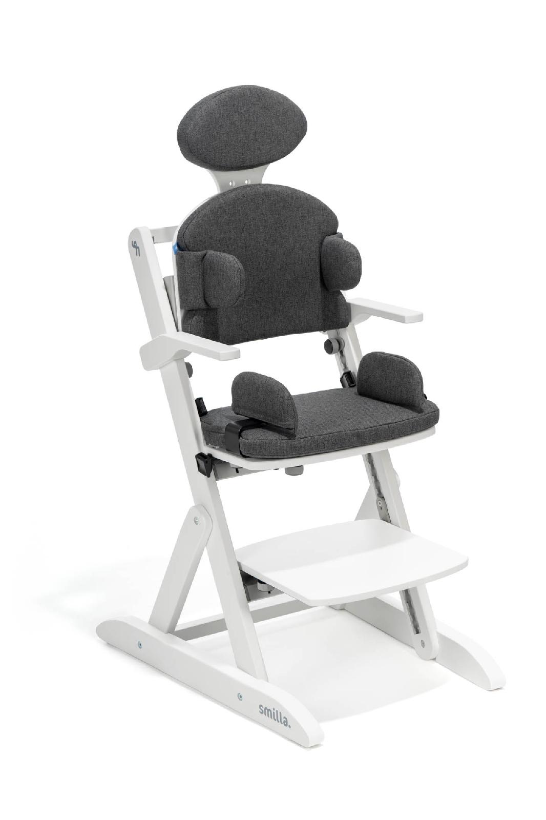 Smilla fremmer aktiv sitting og støtter barnets utvikling. Smilla kan enkelt reguleres og dermed vokse med barnet. For at bruker skal kunne sitte behagelig ved bordet, er det enkelt å flytte sete- og fotplaten opp og ned eller frem og tilbake. Smilla er laget av tre, og levers i naturlig bøk og nå også i grå eller hvitbeiset utførelse. Stolen kan være velegnet hjemme, eller i barnehage, eller skole.Stort tilbehørsprogram kan tilpasses individuelt etter behov. Smilla leveres i tre forskjellige størrelser og to forskjellige høyder.