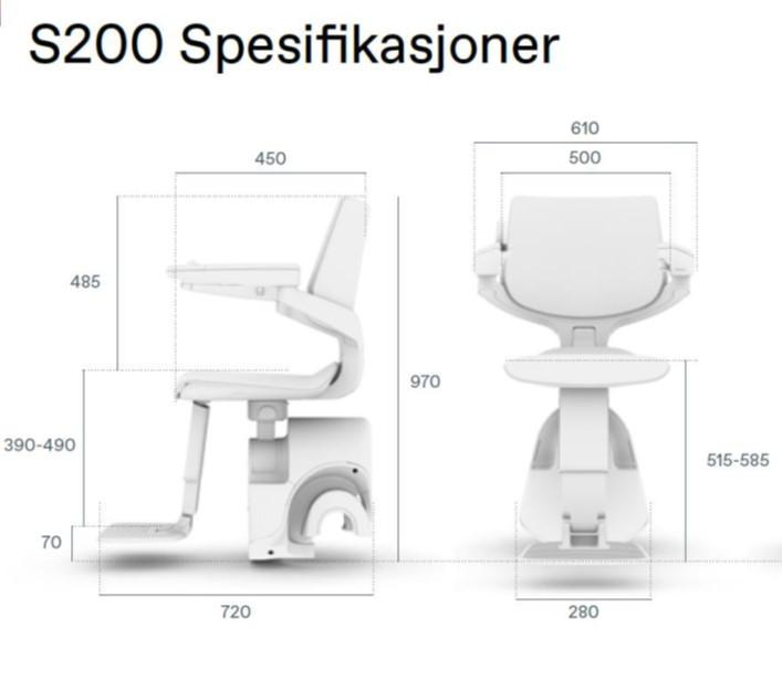 Trappeheis for bruk i innendørs trapp med sving eller repos. S200 betjenes med joystick og stolen har autosving som fungerer under kjøring. Manuelt fotbrett. Den kan alltid monteres på innerløp, men også ytterløp dersom ønskelig. Finnes for montering på høyre og venstre side. Brukerstyrt batteridrevet nødsenk. Maks brukervekt: 125 kg.